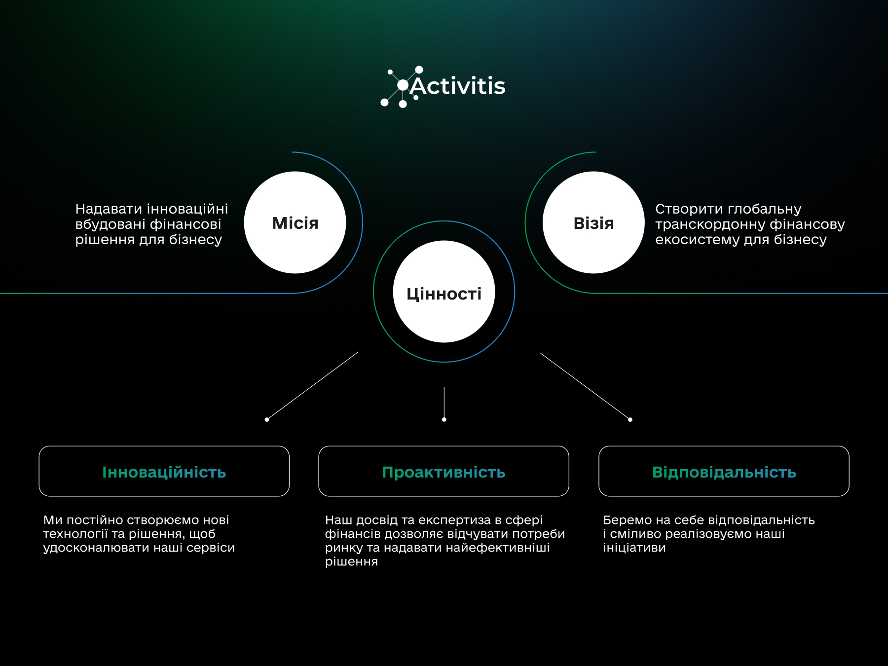 Activitis – фінтех-компанія, яка створює інноваційні рішення для бізнесу та фінансового сектору, що формують сучасну екосистему й посилюють економіку країни.